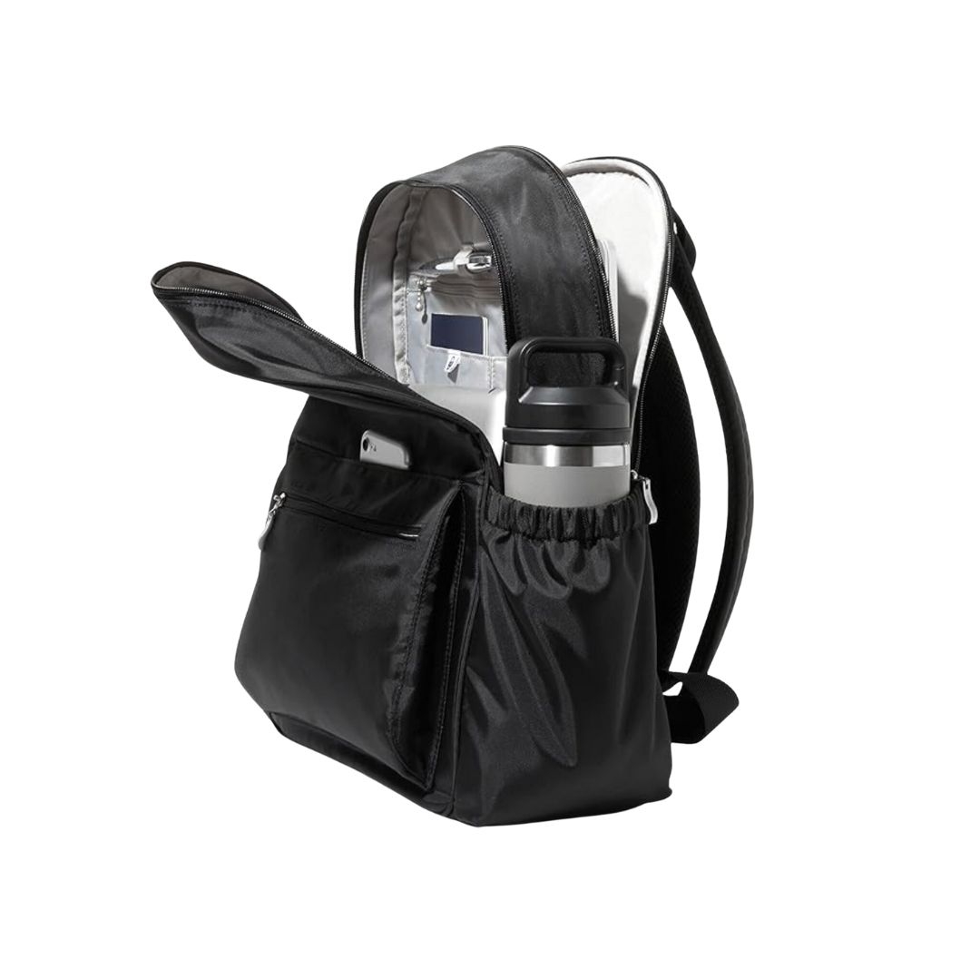 It’s lightweight, cleans easily, has a luggage sleeve, a padded spot for laptops, side pouches big enough to hold 20-oz water bottles, and enough pockets to tame your odds and ends.